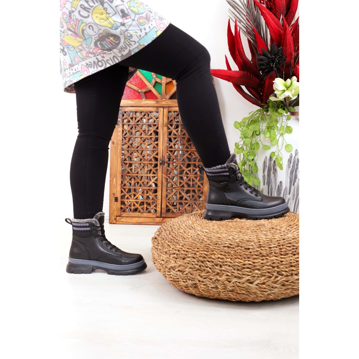 Konfores 1401 Kauçuk Tabanlı Bayan Spor Bot - NKT01401-siyah gri-36